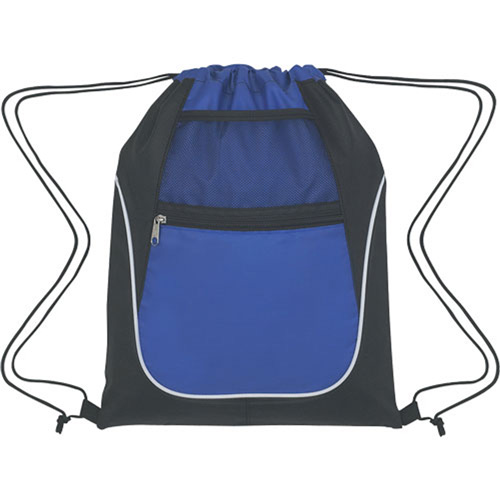 Drawstring main compartment, front zippered pocket, and front mesh pocket